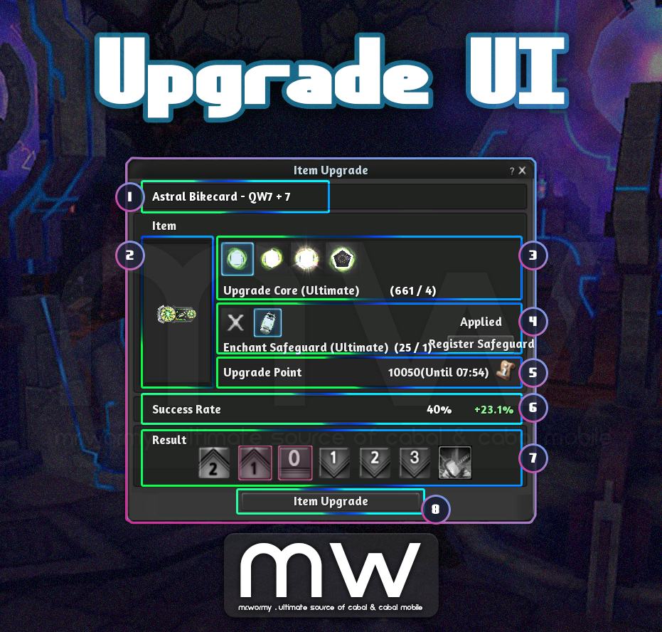 - [1] Item Name will be shown here based on the item player registered into the Upgrade UI.