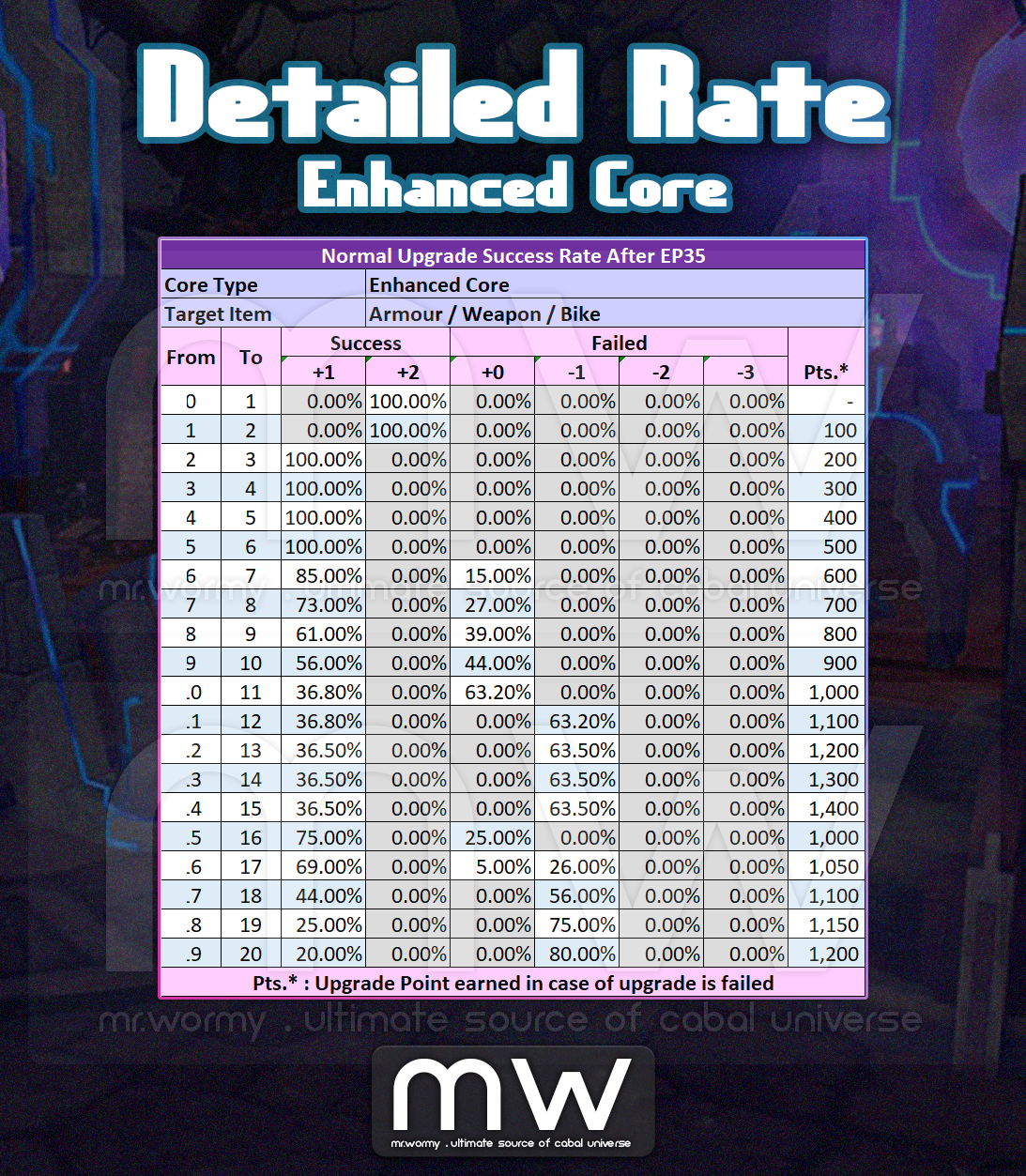 - The Normal Upgrade gets some changes in Episode 35 with Success Rate, Core Consumption and some other changes; therefore, the details of Normal Upgrade results are separated into 2 different section: