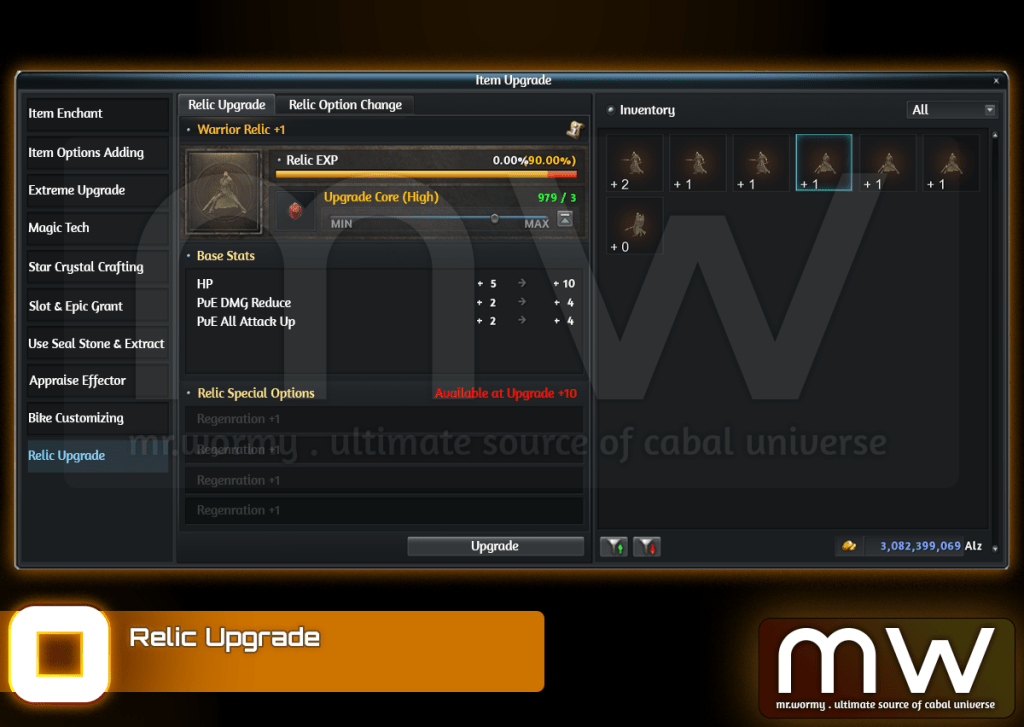 - Using Upgrade Core to upgrade Relic Basic Options to Lv. 10