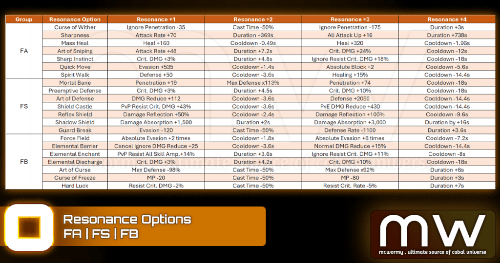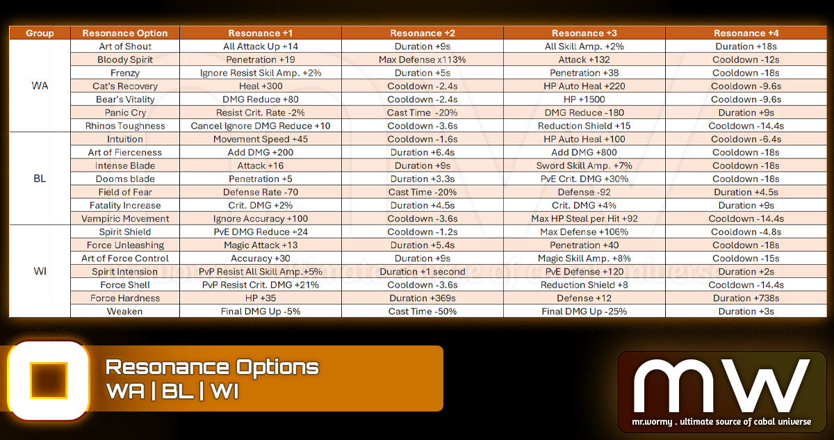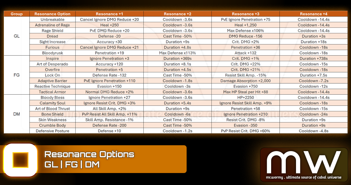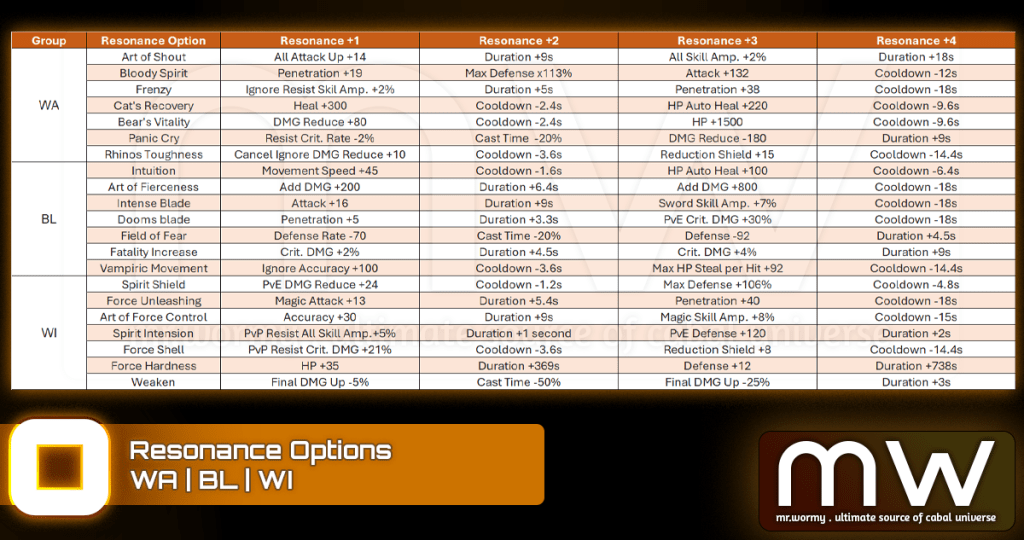 - If there is any duplicated option among 4 Resonance Option, that option will be additionally enhanced, refer to the Resonance Option below.