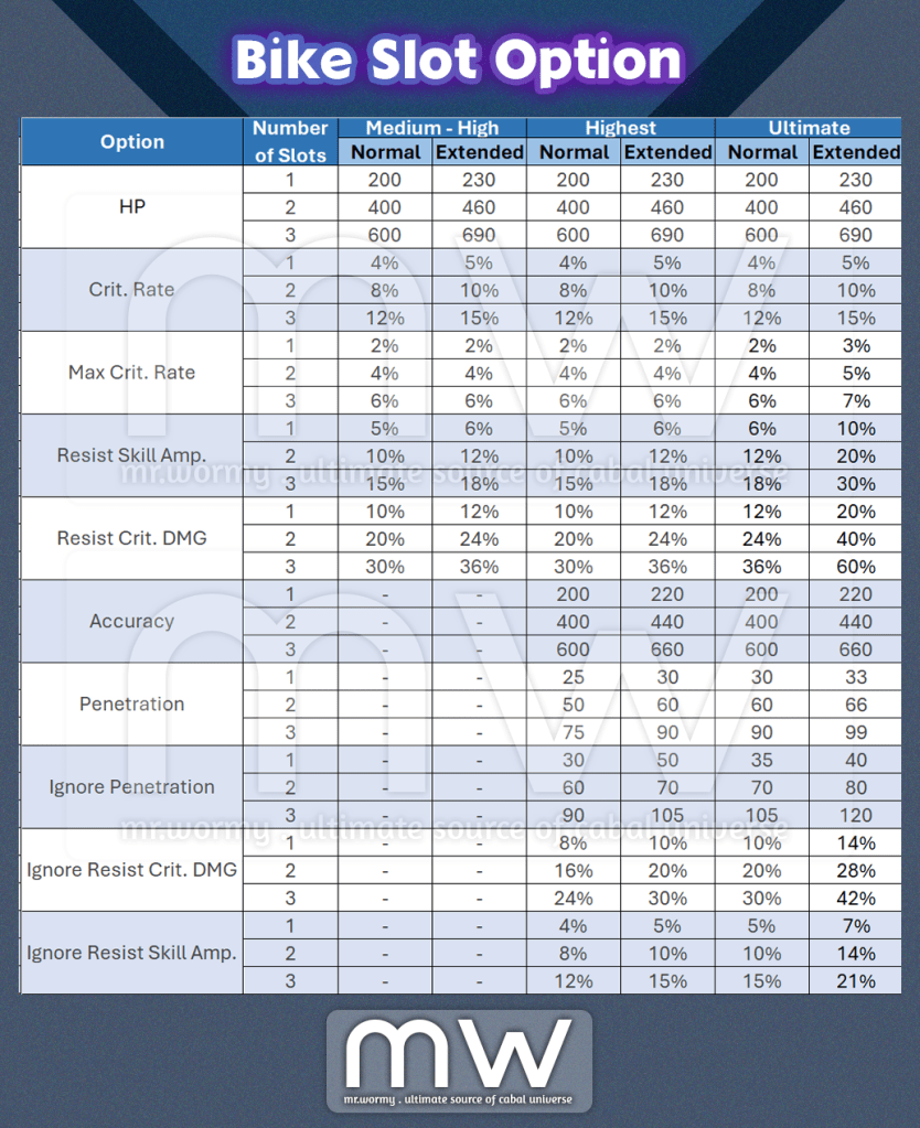 - Here is the list of all Force Slot Options for all Bike items depend on grade. Some options are available only for certain grade.