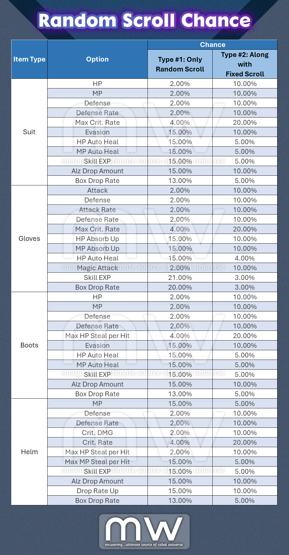 - Chance to get options while using Random Scroll on Suit / Gloves / Boots / Helm:
