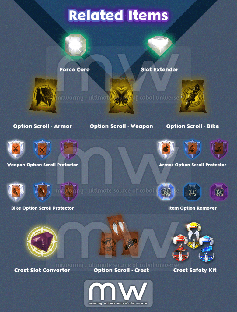 - Depends on items, different grade of Force Core / Slot Extender / Option Scroll are required.