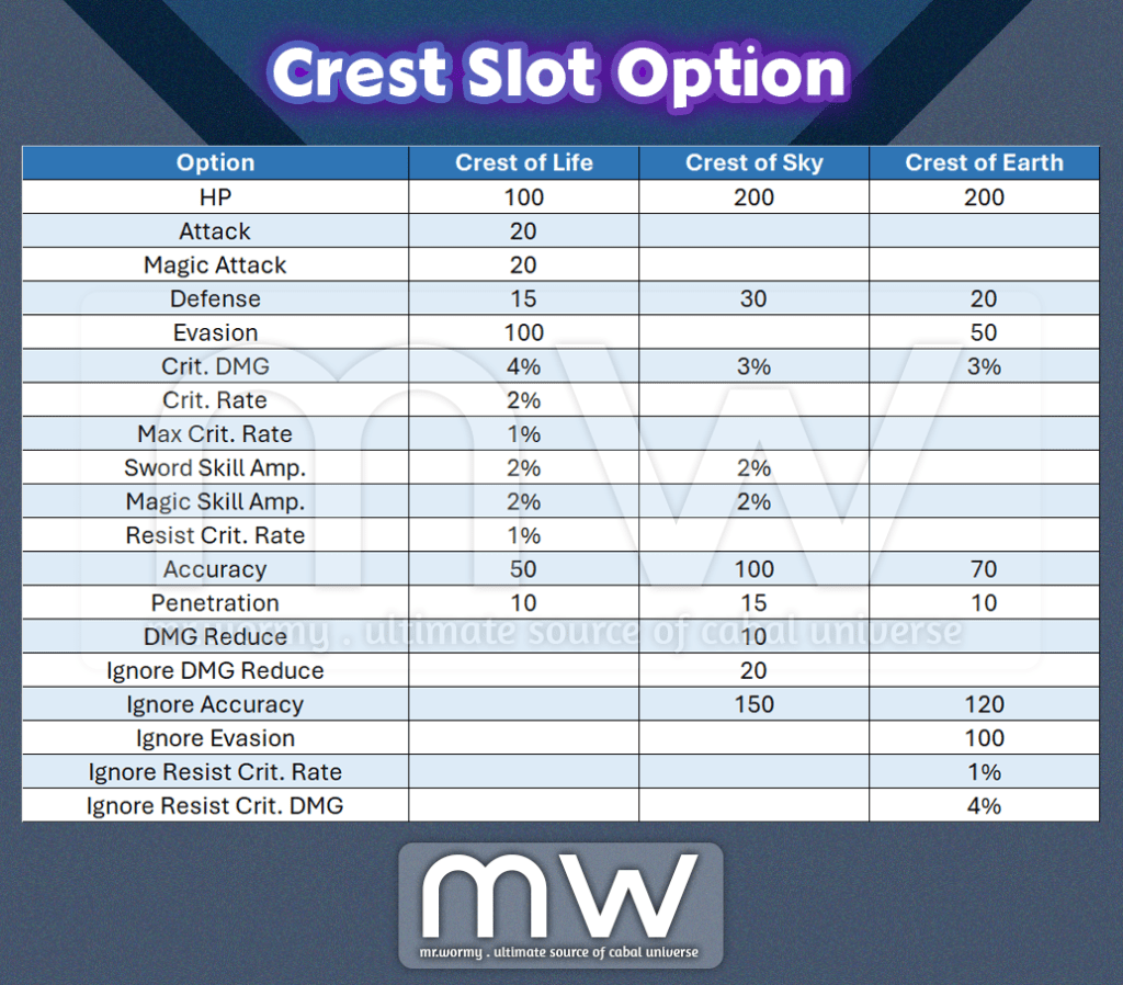 - Here is the list of all Force Slot Options for all Crest items depend on type. Some options are available only for certain type.