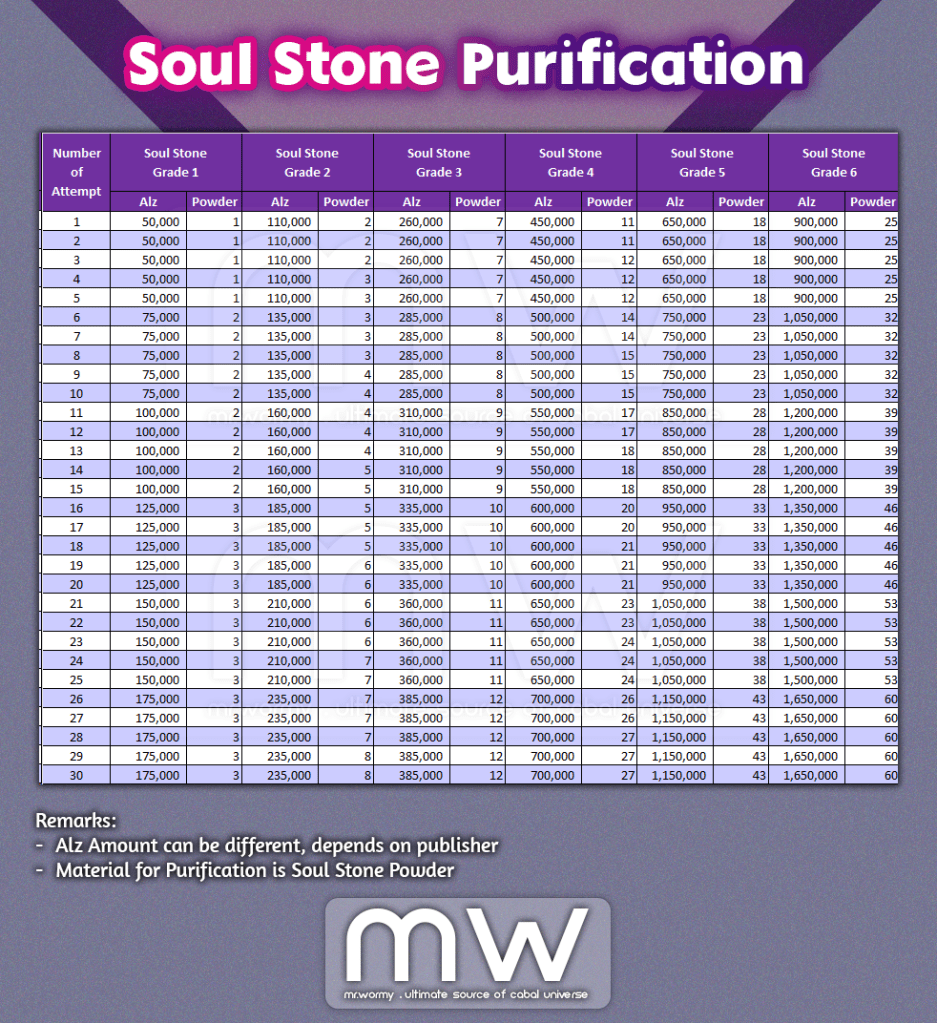 - Purification Costs are calculated based on total “Number of Attempt” (both Purification and Encroachment together) on that Soul Stone: