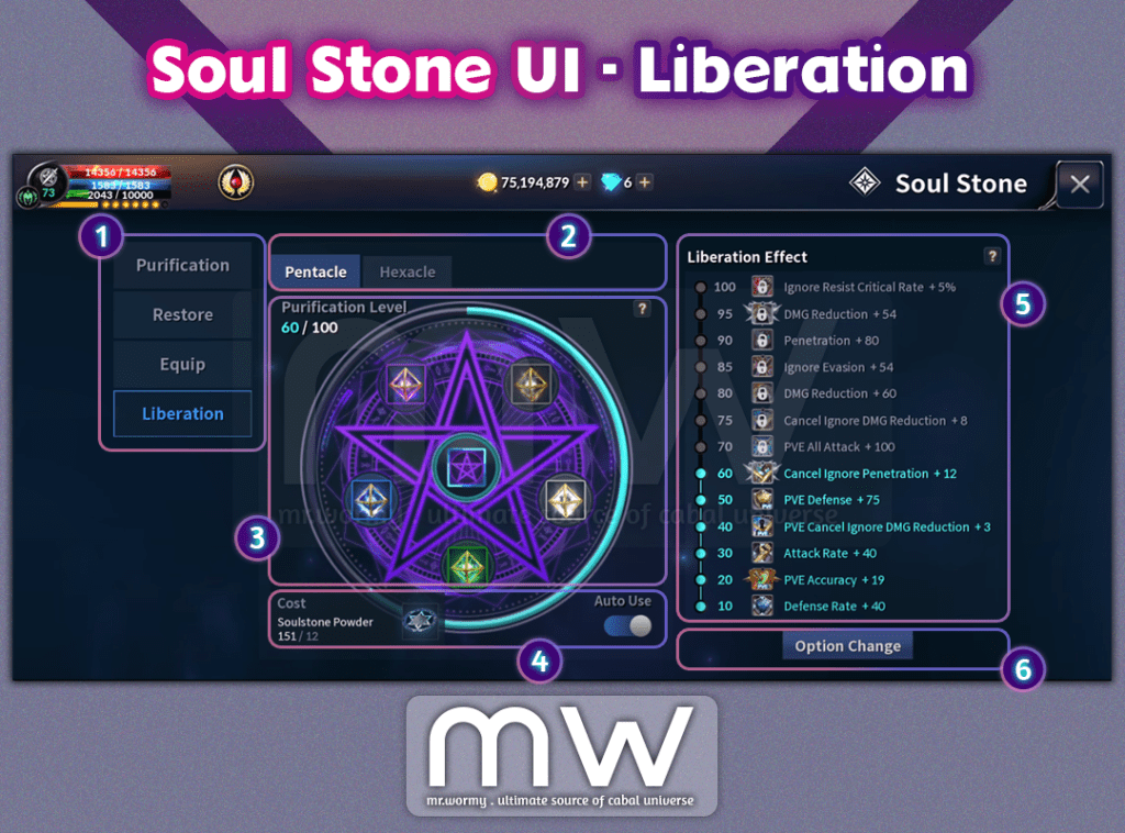 Soul Stone is a Cabal Mobile exclusive content, player can upgrade the Soul Stone (called as Purification process) and equip it to gain stats, based on the total level of Soul Stone upgrade, additional stats can be obtained (called as Liberation Buff).