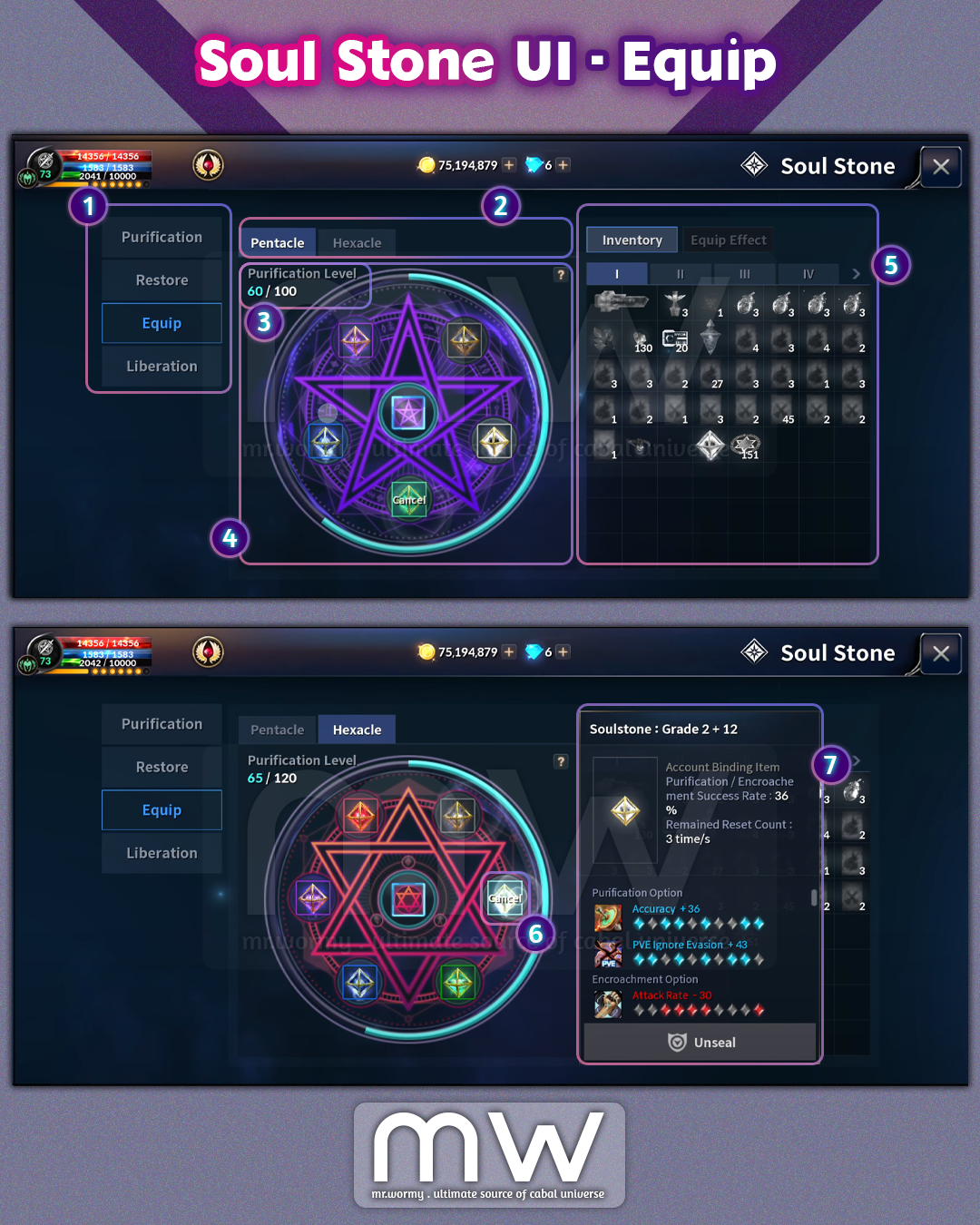 - Purification Level is counted based on all Success Attempt of Purification (but not Encroachment) of all equipped Soul Stones of the current Magic Circle.