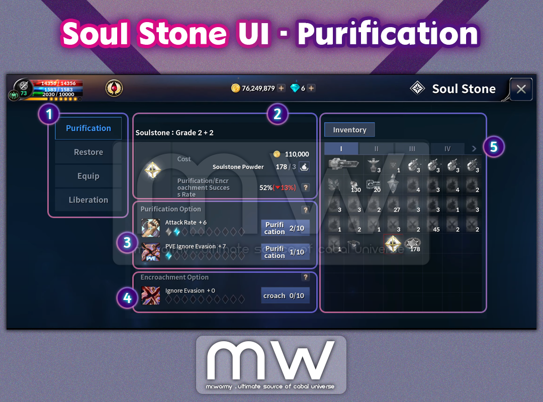 - Select “Purification” from the tab list [1] in Soul Stone UI.
